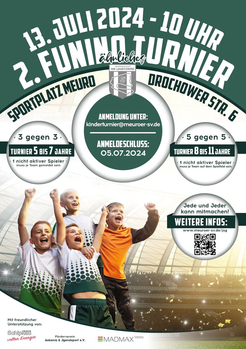 Am Samstag, dem 13. Juli 2024 veranstaltet die Jugendspielgemeinschaft ihr 2. Funino-ähnliches Kinderfußballturnier. Austragungsort ist von 10-12 Uhr der Sportplatz Meuro. Alle Kinder der Gemeinde Schipkau im Alter zwischen 5-11 Jahre können mitmachen. Alle Infos findet ihr hier…